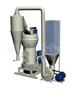 原礦物料細碎后,由提升機將物料送至小料倉,再經振動給料機均勻連續的送入主機磨室內,在高速旋轉的離心力作用,磨輥向外擺動,緊壓于磨環,鏟刀鏟起物料送到磨輥與磨環之間,磨輥滾動碾壓將物料研磨。物料研磨后的細粉隨鼓風機的循環風被帶入分析機進行分選,細度過粗的物料落回重磨,合格細粉隨氣流進入成品旋風集粉器,并經出粉管排出,即為成品。在磨室內因被磨物料中有水分,研磨時生熱,水氣蒸發,以及整機各管道接口不嚴密,外界氣體被吸入,使循環氣壓增高,保證磨機在負壓狀態下工作,所增加的氣流量通過余風管排入除塵器,被凈化后排入大氣。