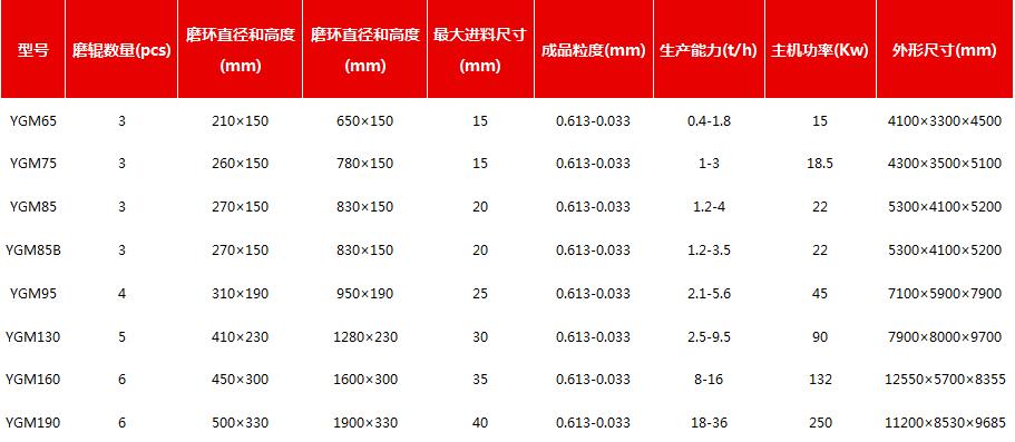 河南佰辰機械廠家生產的YGM高壓懸輥磨粉機有YGM65、YGM75、YGM85、YGM85B、YGM95、YGM130、YGM160、YGM190等十多個型號,型號規格多樣化,應用范圍廣,可以滿足多用戶的不同需求,同時該系列設備是集雷蒙磨粉機優勢于一體的新型環保磨粉設備,具有生產能力大、壽命長結構簡單、維修方便、運行平穩等特點,報價根據型號不同幾萬幾十萬之間。